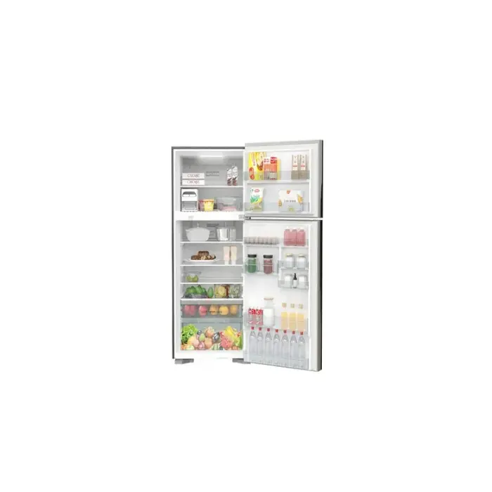 ثلاجة بابين هيتاشي بسعة كبيرة تقارب 19 قدم، مناسبة جدًا للعائلات المتوسطة والكبيرة. التقسيم الداخلي عملي، حيث توفر مساحة واسعة لحفظ كميات كبيرة من الطعام، مع توزيع مريح بين حيز التبريد وحيز التجميد، مما يساعد على تنظيم المحتويات بسهولة بدون تكدس.