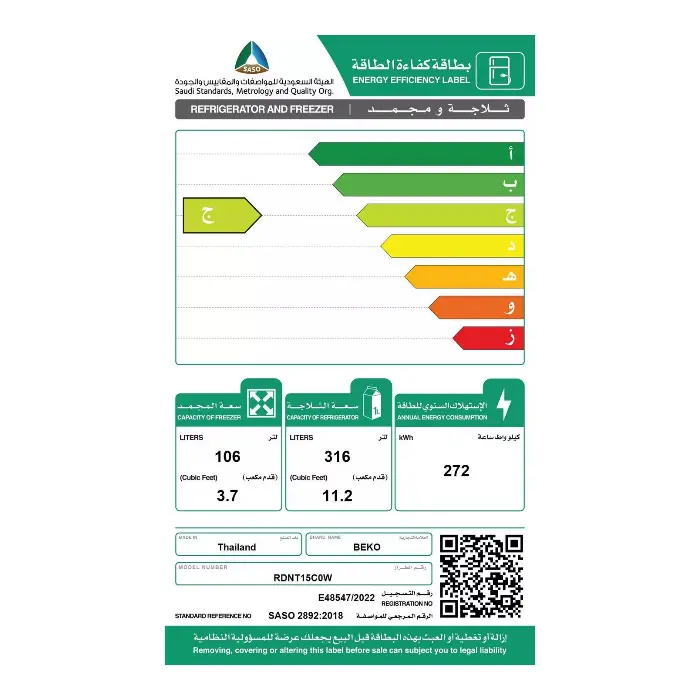 - سعة الثلاجة : 316 لتر