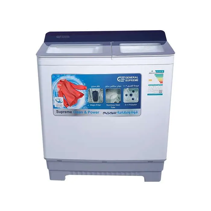 غسالة ملابس حوضين جنرال سوبريم نصف أوتوماتيك، أي أنك تضيف الماء والصابون بنفسك ثم تختار البرنامج المناسب. التحكم يتم عبر مقابض دوارة واضحة وكبيرة تسمح لك بـ:ضبط مدة الغسيل حسب نوع الملابس. وتحديد وقت العصر للحصول على ملابس شبه جافة وتصريف المياه بعد الانتهاء من الدورة بسهولة.