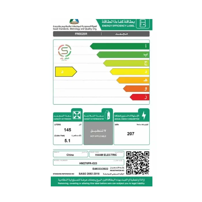 تبريد ديفروست مميز فريزر ارضي هام 5 قدم - أبيض HM270FR-O23