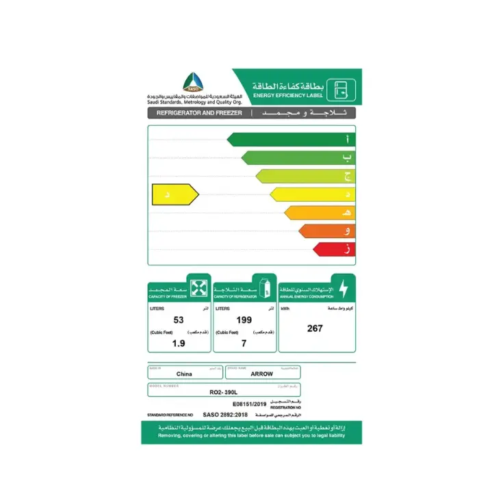 تم تصميم ثلاجة بابين ارو لتكون ذات كفاءة عالية في استهلاك الطاقة (عادةً بفضل ضاغط موفر واستخدام غاز تبريد حديث مثل R600a). هذا التوفير يساهم في تقليل فاتورة الكهرباء، ويعكس التزام الشركة بالمعايير البيئية الحديثة لأجهزة التبريد.