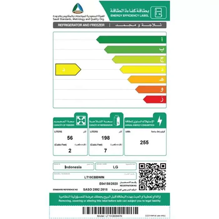 - سعة الثلاجة : 198 لتر