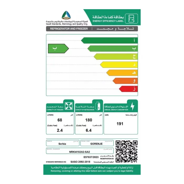 ثلاجة بلت ان بابين جورينيه 9 قدم – نوفروست – أبيض NRKI4182A2-SA2
