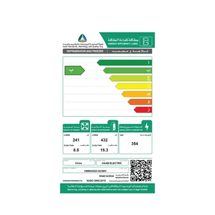 - سعة الثلاجة : 432 لتر