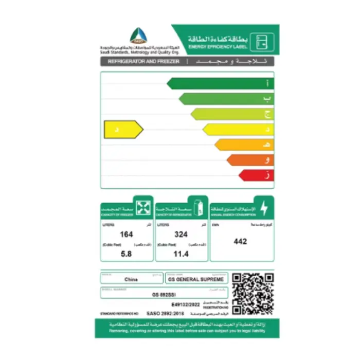 - استهلاك الطاقة السنوي :442كيلو وات/ساعة