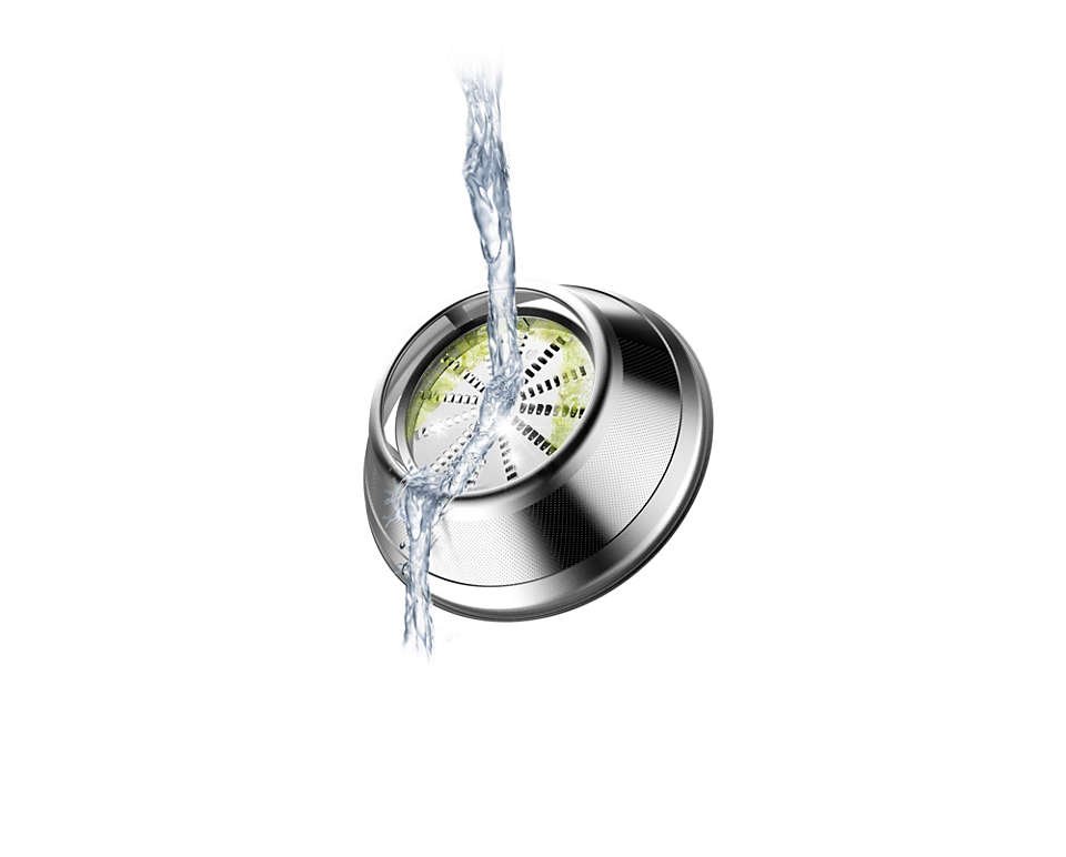 تعتمد العصارة على نظام EasyClean الذي يسهل تنظيفها خلال دقائق قليلة، حيث يمكن إزالة بقايا اللب والعصير بسهولة دون الحاجة إلى فرك أو أدوات خاصة. كما أن التصميم الداخلي الأملس يقلل من التصاق البقايا، مما يجعل العصارة جاهزة للاستخدام مرة أخرى بسرعة وبأقل مجهود ممكن.