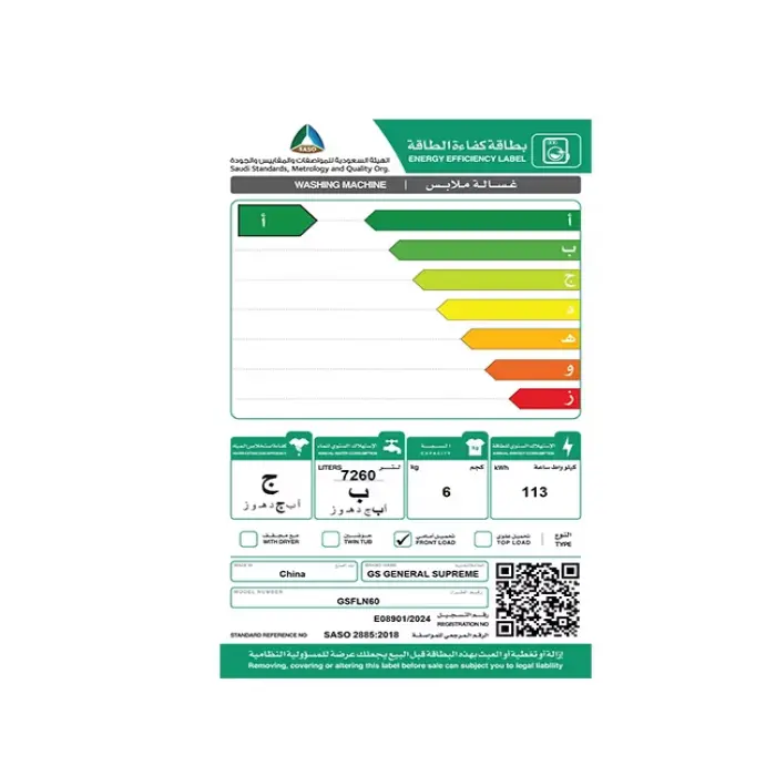 غسالة أتوماتيك امامية جنرال سوبريم 6 كيلو ـ 15 برنامج ــ فضي GSFLN60