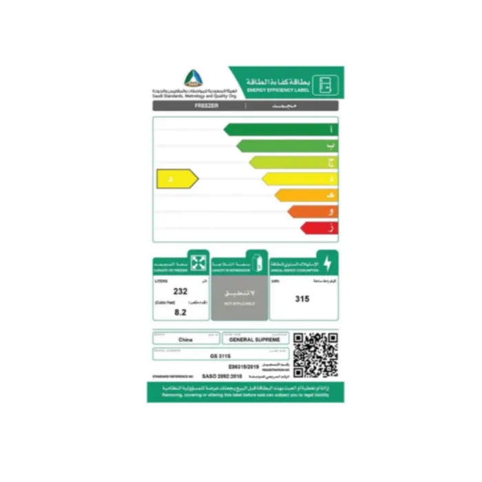 يعتمد فريزر 8 قدم عامودي جنرال سوبريم على غاز تبريد صديق للبيئة يساهم في تقليل التأثيرات الضارة على البيئة، مع الحفاظ على كفاءة تبريد ممتازة. هذا النوع من الغاز يتميز بأمانه العالي وكفاءته في نقل البرودة، مما يجمع بين الأداء القوي والالتزام بالمعايير البيئية الحديثة.
