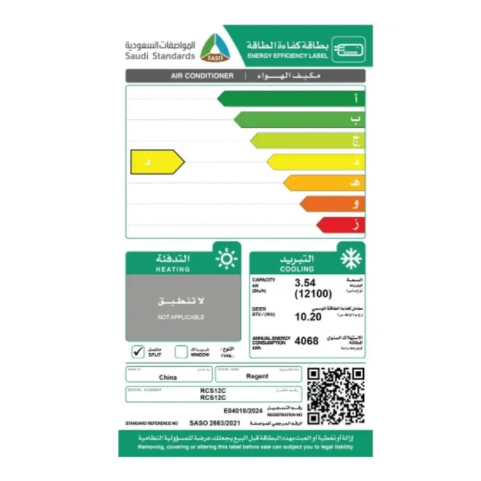 يستخدم مكيف ريجنت سبليت 12100 وحدة بغاز تبريد R410a صديقًا للبيئة يتميز بقدرة عالية على نقل الحرارة، مما يساعد على تحقيق تبريد سريع وفعّال مع كفاءة أفضل في استهلاك الطاقة، إلى جانب تأثير أقل على طبقة الأوزون مقارنة ببعض الغازات التقليدية.