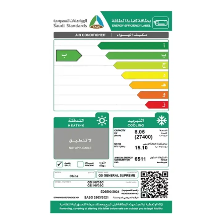 العلامة التجارية : جنرال سوبريم  القدره الاسميه : 2.5 طن  القدرة الفعلية : 27400 وحدة نوع الهواء : بارد  تتميز بتقنية انفرتر موفر للطاقة تبريد سريع بخاصية Turbo مؤشر لتنظيف الفلتر فلتر لتنقية الهواء من الغبار  وضع النوم الهادئ تشغيل هادي التنظيف الذاتي  توزيع هواء رباعي الاتجاهات  غاز تبريد R410a صديق للبيئة خاصية I Feel لاستشعار الحرارة بدقة ريموت كنترول + تحكم ذكي عبر Wi-Fi تصميم عصري وانيق  بلد المنشأ : الصين الضمان الشامل : عامين