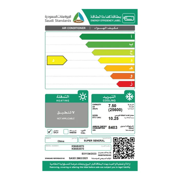 مكيف سوبر جنرال سبليت الترا 25600 وحدة – بارد KSGS3070