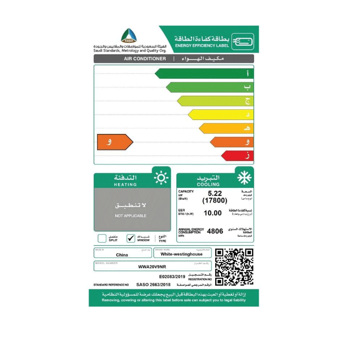 خصائص مكيف وايت وستنجهاوس شباك 17800 وحدة – بارد :
